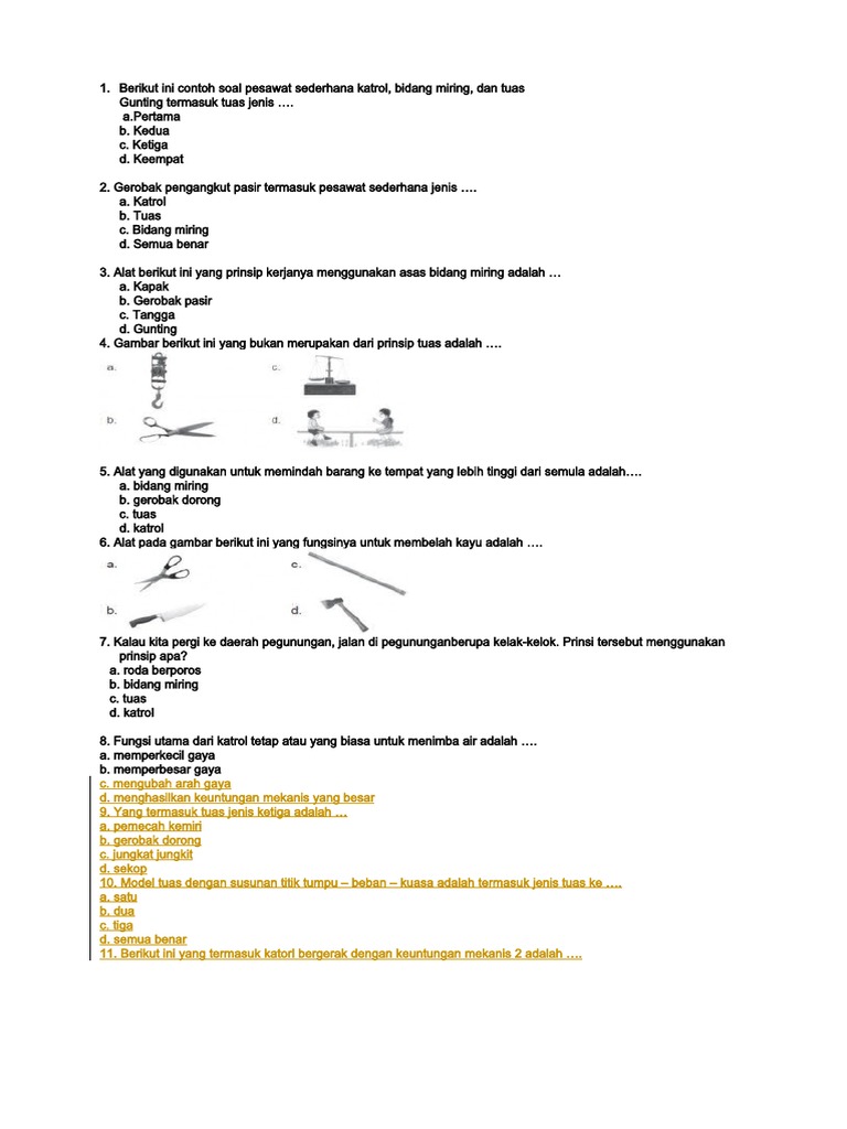 Tuas/pengungkit, katrol, bidang miring, dan roda berporos/ roda bergandar. Tuas/pengungkit, bidang miring, katrol dan roda berporos. Misalnya, alat pembuka tutup botol, menggunakan prinsip kerja pesawat tuas pada umumnya, soal ipa fisika prinsip kerja pesawat sederhana berbentuk pilihan ganda kategori mengidentifikasi atau pengenalan. Jenis pesawat sederhana ada empat yaitu tuas/ pengungkit, bidang miring, katrol dan roda berporos. Marilah kita bahas satu persatu.