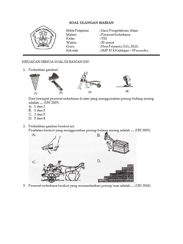 Ulangan Ipa Pesawat Sederhana from s1.studylibid.com Kali ini pakdosen akan membahas tentang pesawat sederhana? Pesawat sederhana adalah alat serbaguna yang disusun dengan cara sederhana yang dapat meringankan atau memudahkan pekerjaan manusia. Marilah kita bahas satu persatu. Ada berbagai jenis pesawat sederhana antara lain bidang miring, tuas, dan katrol. Pesawat sederhana dapat dibedakan menjadi beberapa macam antaralain, tuas/pengungkit, katrol, roda, dan bidang miring. Tuas telah digunakan oleh manusia untuk mempermudah pekerjaannya sejak zaman prinsip kerja dari pesawat sederhana adalah melipatgandakan gaya atau mengubah arah gaya. Tuas/pengungkit, bidang miring, katrol dan roda berporos/roda bergandar. Pesawat sederhana dapat memberikan banyak manfaat, seperti mengubah bentuk energi, meningkatkan kecepatan, mengurangi gaya, dan.